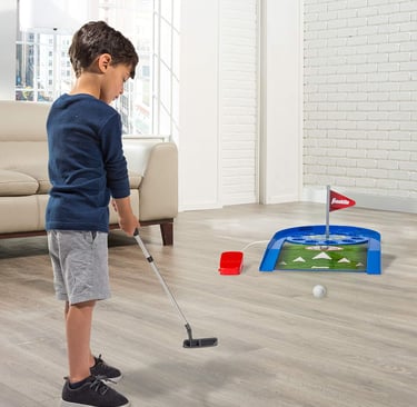 Fun indoor mini golf game with a spinning target and automatic ball return — includes a putter and 10 foam balls for competitive play and skill practice for kids and families.