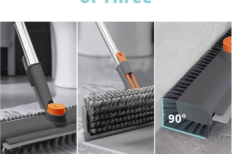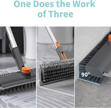 3-in-1 gray scrub brush with long handle, stiff bristles, and scraper—perfect for cleaning floors, walls, patios, and bathrooms effortlessly.