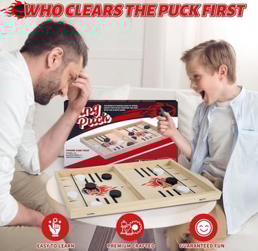 Wooden tabletop hockey game for 2 players — fast-paced slingshot action, smooth wooden surface, and fun for family nights, parties, and skill development for kids 6+ and adults.