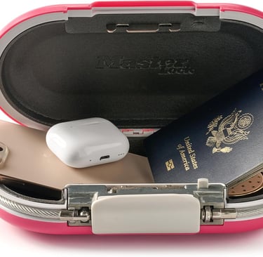 Compact pink lock box with customizable combination—perfect for securely storing your phone, passport, cash, and valuables while traveling or on the go.