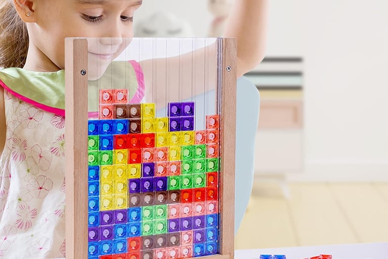 Fun and educational 3-D block-arranging puzzle with 42 colorful pieces and a sturdy wooden frame — great for boosting logic, coordination, and creativity while playing.